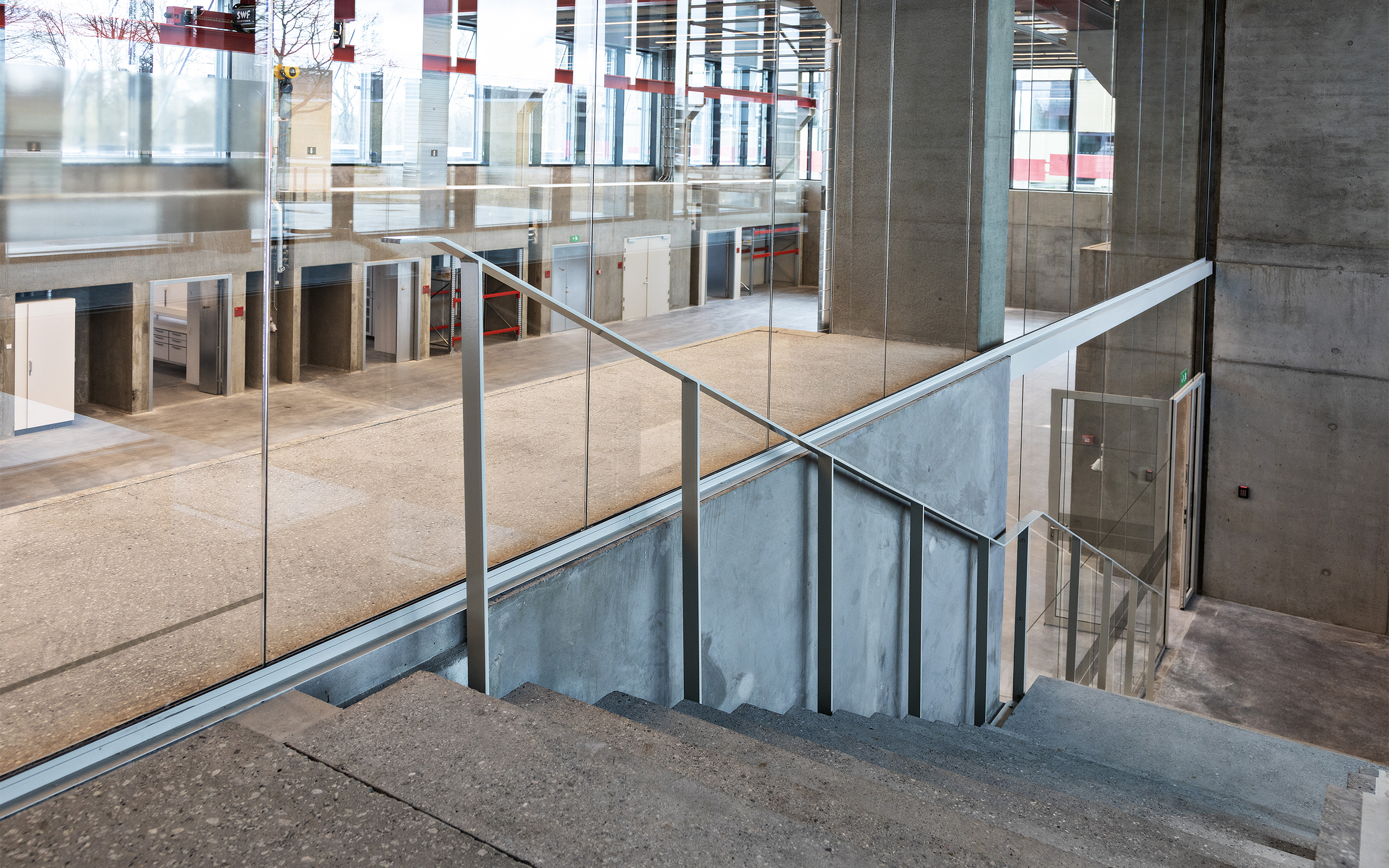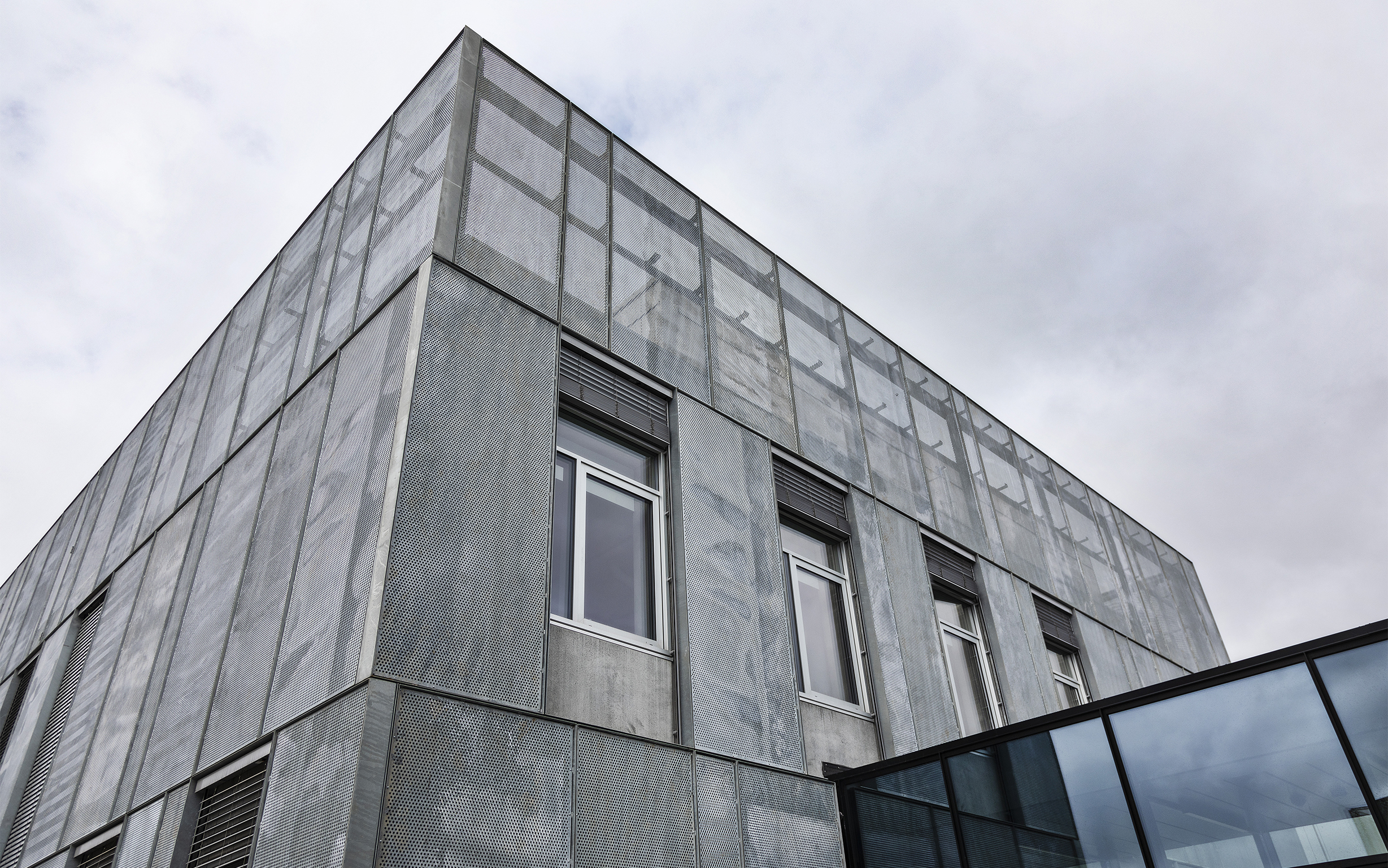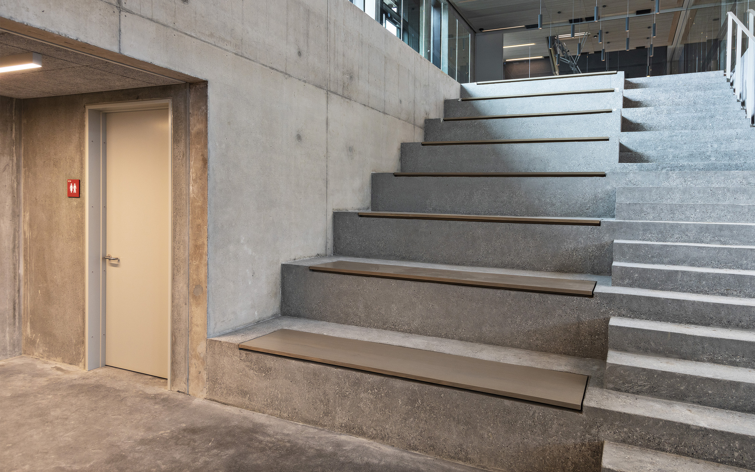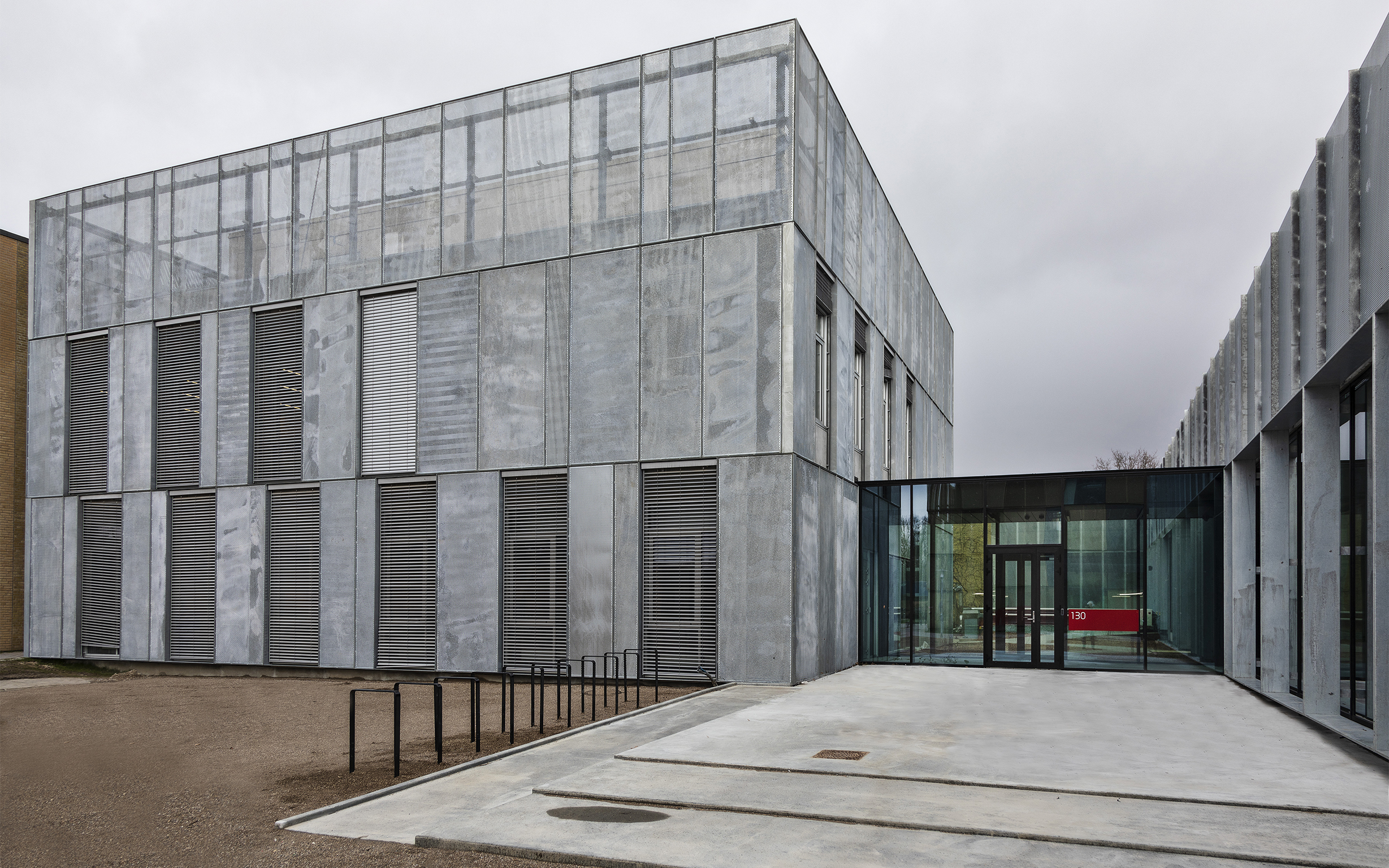 Dele af bygningen er opført med en ny grøn beton, der reducerer CO2-aftrykket på klimaet med op til 30%. Bygningen fremstår med vægge og gulve i synlig rå beton.
