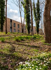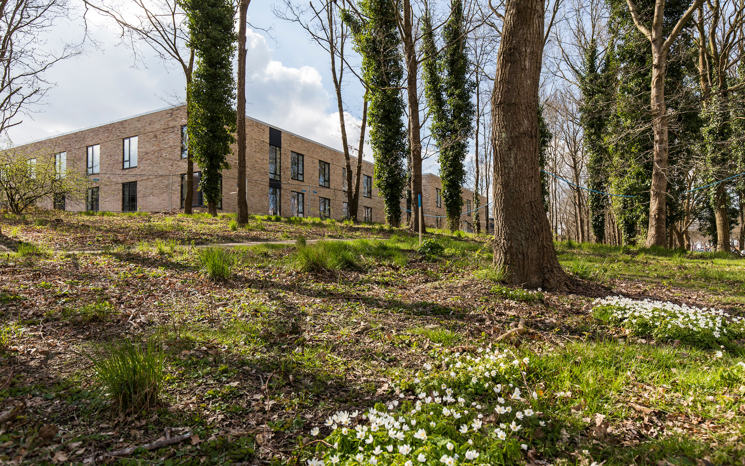 Projektet omfattede opførelse af 200 almene kollegieboliger. Otte af disse blev indrettet som handicapvenlige boliger. Vi opførte byggeriet med lette facader mod indre gårdrum. Mod den eksisterende egeskov blev facaden opført med tung bagmur og facade i ”gamle” mursten.