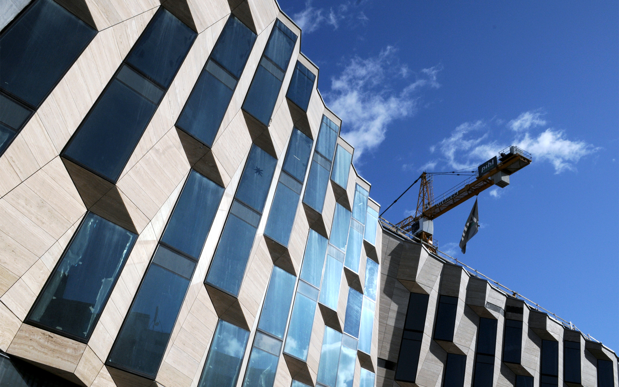 Bygningen har en karakteristisk facetteret facade, beklædt med Travertin og glas, som orienteres strategisk for at styre udblik samt afskærme for solindfald. Karnapper er indbygget i den facetterede facade.