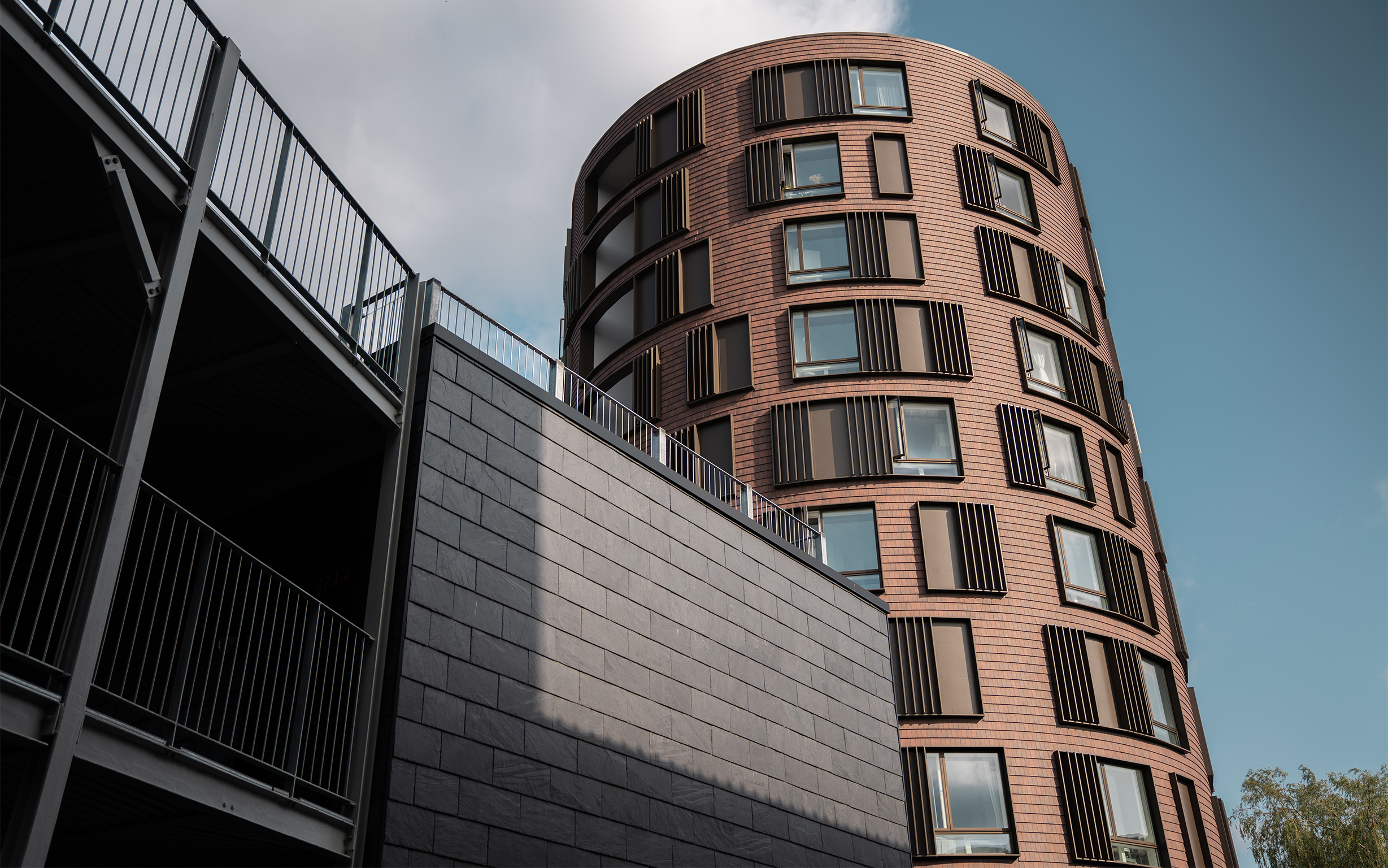 En cirkulær bygning på ti etager placeret langs Jagtvej og to lavere bygninger i henholdsvis to og tre etager blev opført i nybyggeri. Den runde bygning rummer 8 boliger på hver etage. Adgang til boligerne i den runde bygning sker enten via trapperum eller elevatortårn i midten af tårnet. I stueetagen er der indrettet fælleslokale.