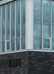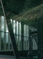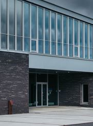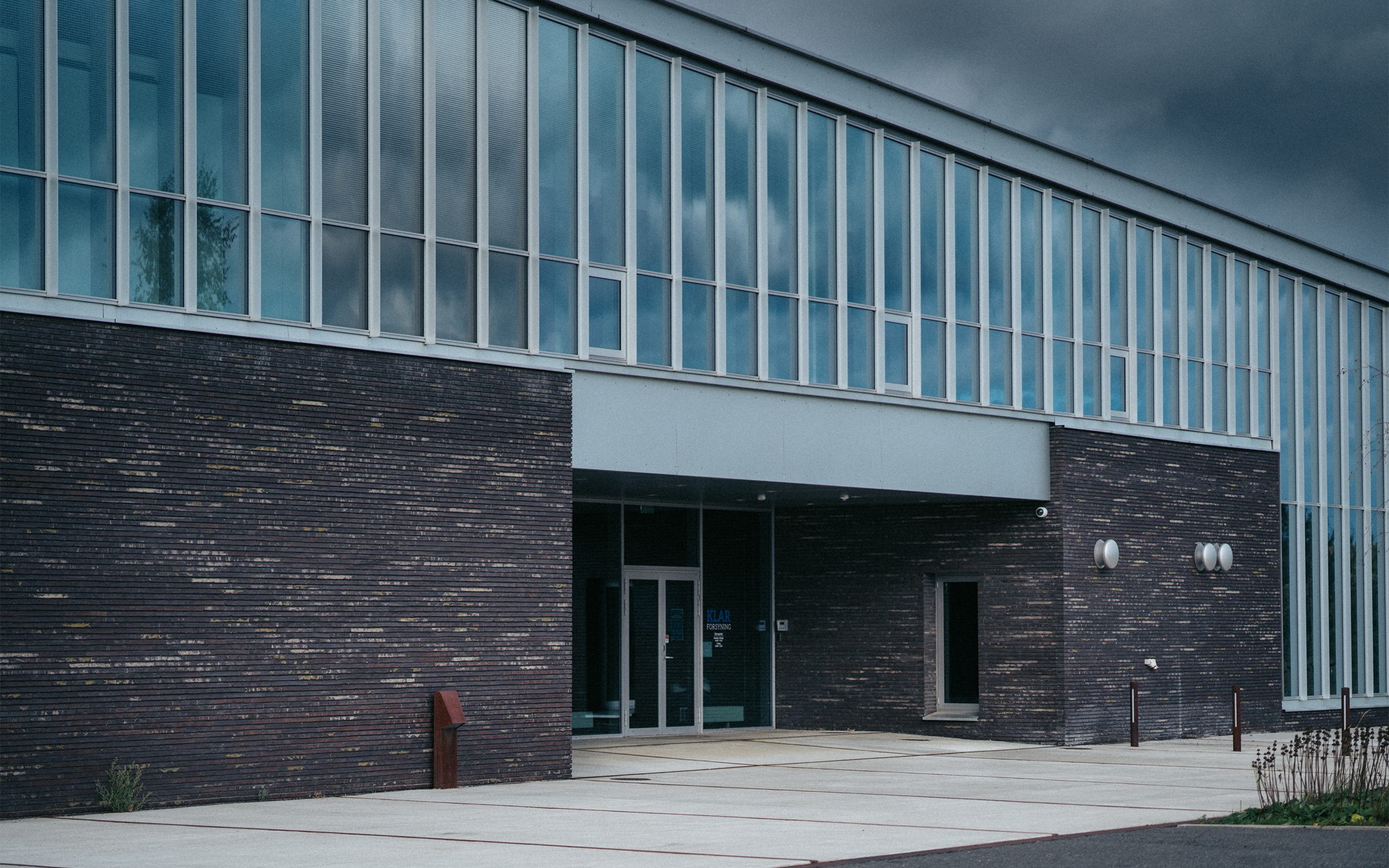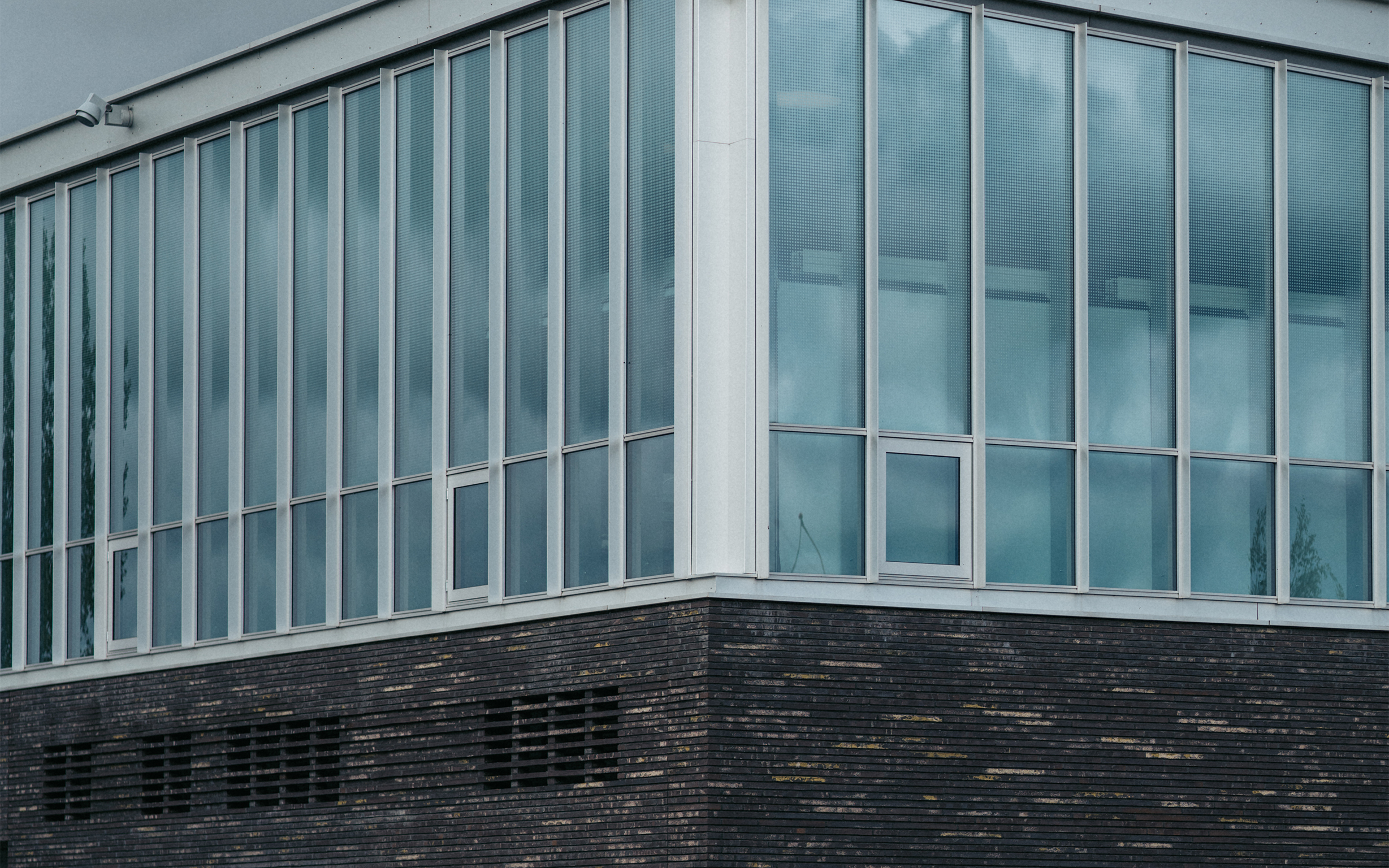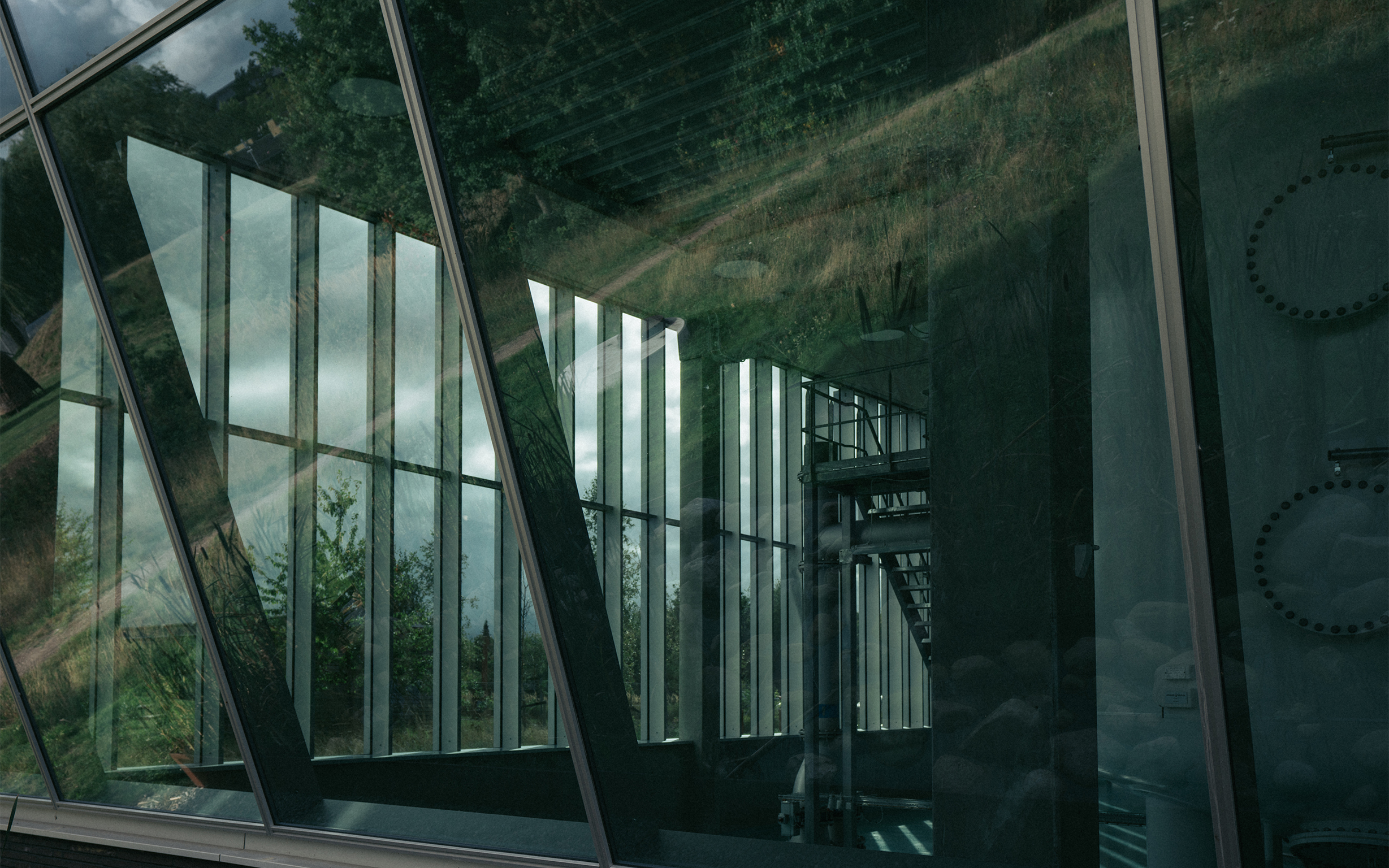Bygningen er udført med en høj grad af synlige installationer og rå betonoverflader.
